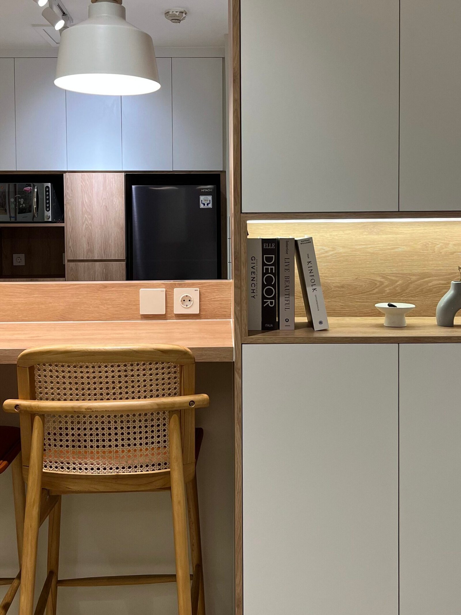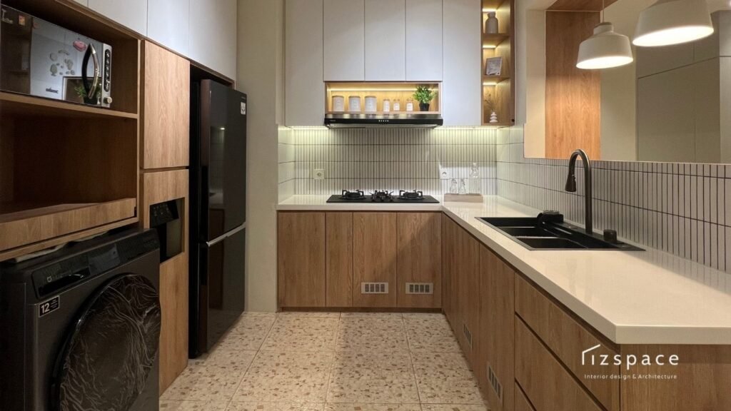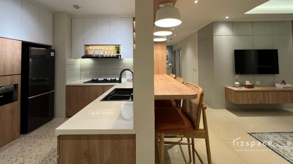 Bagian dapur menjadi area yang cukup banyak diperhatikan oleh penghuni apartemen. Oleh karena itu, Rizspace merancang kitchen set dengan tampilan clean, fungsional, dan mudah dirawat. Sentuhan kayu dan pencahayaan lembut membuat dapur tidak hanya indah dilihat, tetapi juga nyaman digunakan setiap hari.