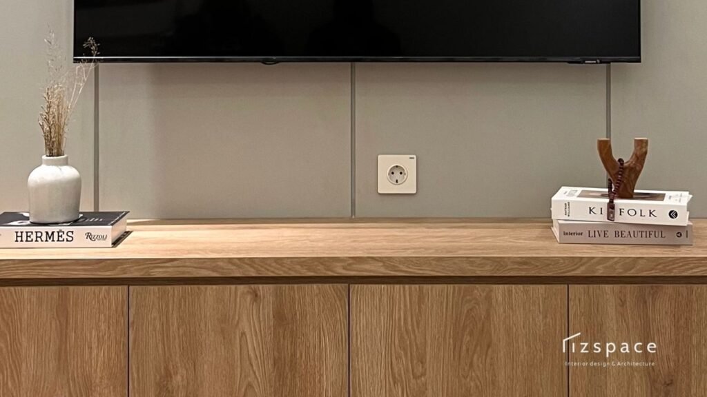 Untuk menciptakan tampilan yang harmonis, kami mengombinasikan material kayu bertekstur halus dengan warna putih bersih. Pendekatan ini memberikan kesan modern, bersih, dan timeless. Kabinet TV serta elemen penyimpanan dibuat dengan desain simple namun tetap menghadirkan identitas karakter ruang.